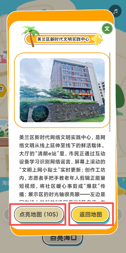 4、点击橙色地标后,可阅读地标介绍,当阅读计时结束,即可点击“点亮地图”按键,随即返回首页。