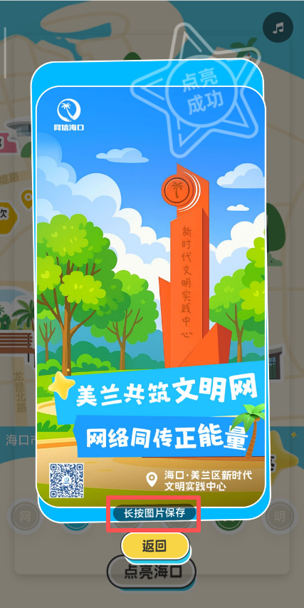 市民游客只需用手机扫描海报上的二维码,即可访问“海口网络文明地图”,在地图中依次点击6个文明地标,就能集齐“网聚椰城文明”关键字,并成功“点亮海口”。系统将自动生成带有个人专属标识的电子徽章海报,这份专属荣誉不仅是个人参与城市文明建设的珍贵纪念,还可分享至微信等社交平台,让“文明椰城”的印记借助社交网络广泛传播。