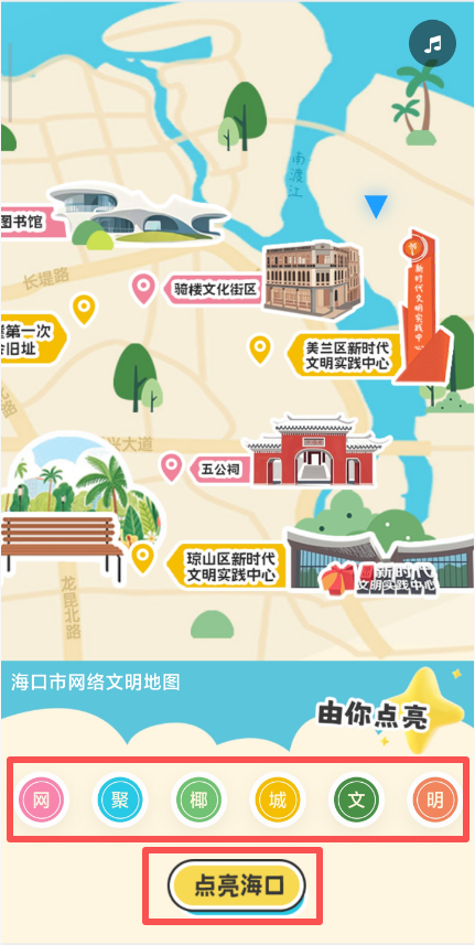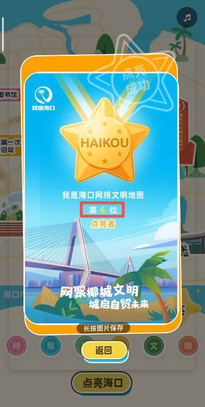 7、“网聚椰城文明”六个文字标识全部被点亮,即可“点亮海口”,系统将生成一份专属电子徽章海报。