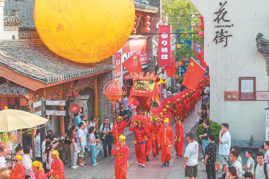 国庆中秋假期,芜湖古城热闹非凡。10月6日,国家级非遗代表性项目徽州板凳龙在此精彩巡游。这条百米长龙由村民举板凳接续而成,随鼓点上下翻腾、左右蜿蜒,为游客带来一场视觉盛宴。王磊摄
