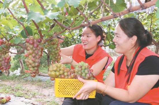 9月30日,亳州市谯城区牛集镇安溜村金山家庭农场葡萄园,党员志愿者帮助果农采摘包装葡萄。武清海摄