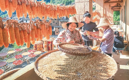 9月17日,歙县深渡镇阳产村,村民忙着晾晒秋收农作物。郑宏摄