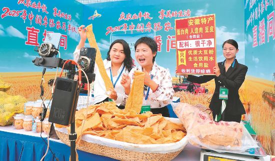 9月20日,在临泉县农民丰收节活动现场,农民主播直播推介销售农副产品。宿飞摄