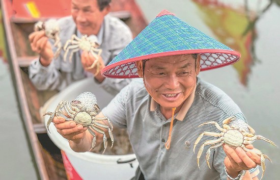 9月25日,当涂县螃蟹开捕节在该县塘南镇白马村河蟹养殖基地举行,养殖户在展示刚捕捞的螃蟹。李博摄