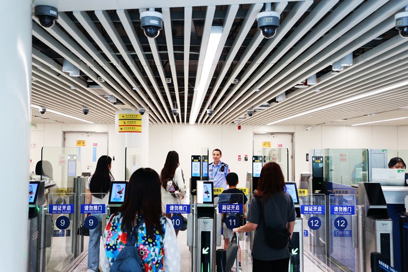 民警正在指导旅客使用自助查验通道通关。陈奕樽摄
