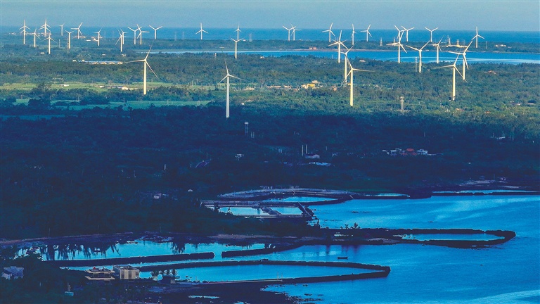 近日,在海南儋州洋浦峨蔓风电场,风车迎风转动,正源源不断地输送“绿电”,助力海南清洁能源岛建设。不仅如此,当地还将风电场与周边旅游资源串联起来,形成一道独特的风景线,在推动节能降碳的同时,促进了旅游业发展。海南日报全媒体记者 张茂 摄