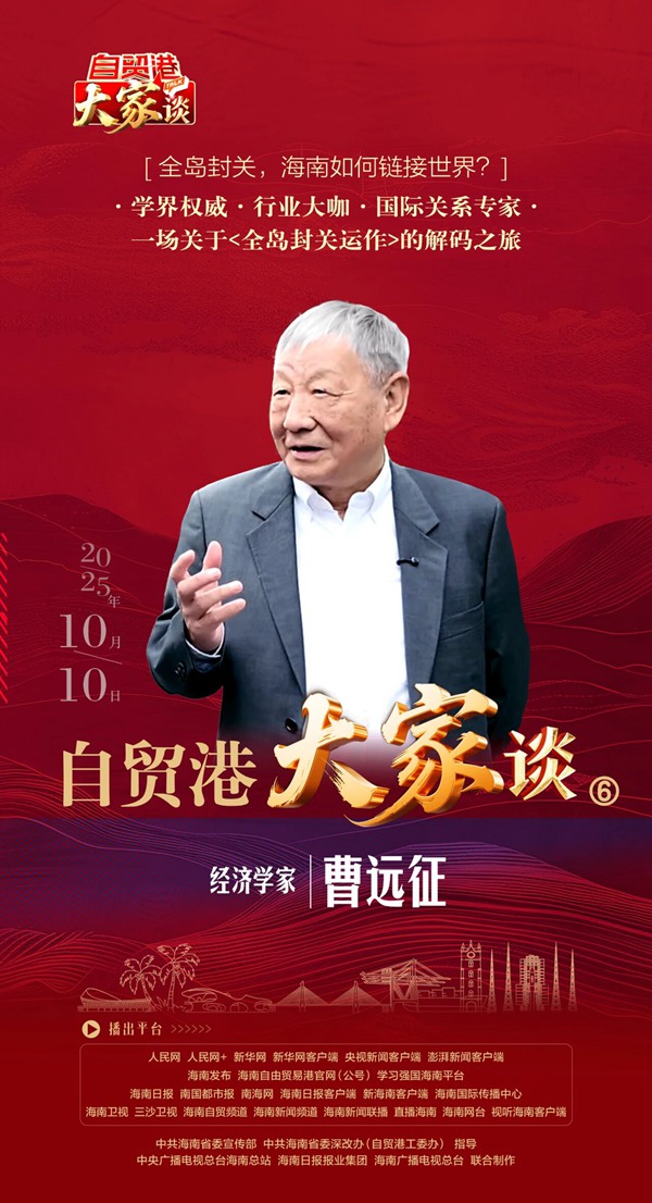 海南自由贸易港全岛封关运作将于2025年12月18日正式启动。应该如何理解全岛封关运作的时代意义?海南自贸港对企业的吸引力在哪?做好离岛免税、医疗、教育“三篇消费文章”,海南如何发力,有何潜力?10月10日,《自贸港“大家”谈》大型访谈节目,将播出第六期,对话经济学家曹远征。