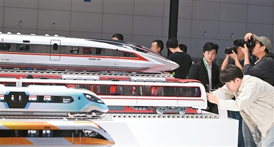 在安徽合肥举行的世界制造业大会上,中国中车展区展出的各类动车组模型吸引众多观众驻足。 |